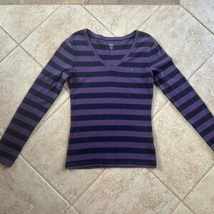 TOMMY HILFIGER V-NECK STRIPED TOP:PREOWNED MEDIUM PLUM PURPLE/MIDNIGHT NAVY
