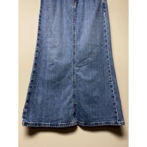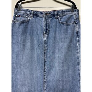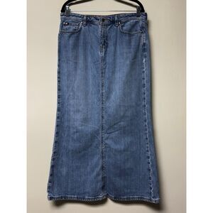 This is the perfectly worn in, vintage midi/maxi length denim skirt from Tommy Hilfiger. Year of manufacture is 2003. Traditional styling in front with kick pleat in back. Front and back pockets, zipper fly. Slight flare.
