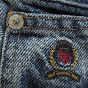 TOMMY HILFIGER WOMEN'S SIZE 6 X 27 JEANS STONE WASHED PERFECT T SPELLOUT FLAG LOGO 90's. Fabric: 100% Cotton. Tag says: "SIZE 6 INSEAM 30", but see actual measurements below. Traditional 5 pocket 90's vintage Perfect T jeans. Zip front fly with intact & working metal zipper. Silver colored riveted button on waistband says: "TOMMY * HILFIGER*" around the circumference. Silver colored rivets on front pockets say: "TOMMY * HILFIGER*" around the circumference. Red, blue, green and gold Tommy crest embroidered on front pocket. 2 inch x 3 inch spellout Tommy flag logo label on back pocket says "TOMMY HILFIGER". Spellout label can be used as a belt loop. 5 belt loops. Yoke in back. Traditional gold top stitching. Tommy Jeans flag label inside back waistband. The pictures show the exact item you are purchasing. ** Color may be slightly off due to monitor color setting/flash of camera **.