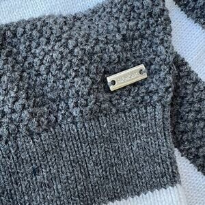 TOMMY HILFIGER WOMEN’S SIZE XS STRIPED SWEATER. Gray with white stripes, long sleeves, drawstring turtle neck. Made of 100% cotton and has a rounded hem line.