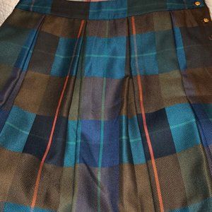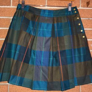 Stunning cheerleader plaid Pleated skirt. Gold accent functioning buttons down the side. Fully lined. 65% polyester 35% rayon measurements taken flat waist 15 1/2” hips 22” length 18 1/2”