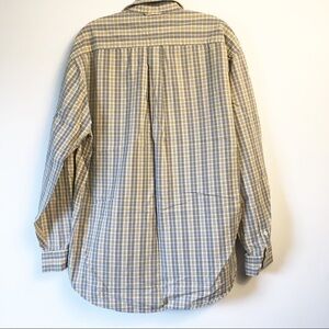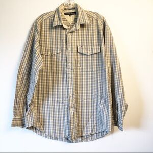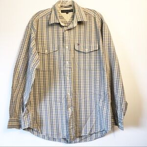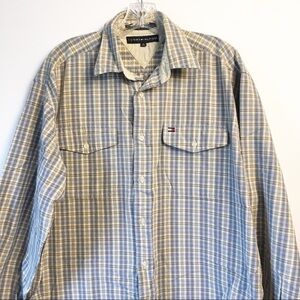 Tommy Hilfiger Long Sleeve Shirt. Sky blue gray with a light beige yellow plaid pattern. Button down. Front pockets.