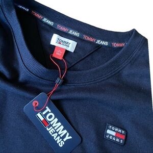 Authentic Tommy Jeans by Tommy Hilfiger Navy Blue Oversized Cropped Sweatshirt with raw edge hem. Approximate measurements are PTP 25” Length 20” Sleeves 19” CREWNECK SWEATSHIRT
