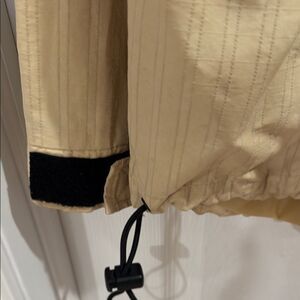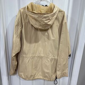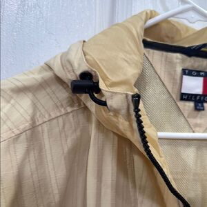 Stay stylish and comfortable in this beige Tommy Hilfiger jacket, perfect for any casual outing. Excellent used condition. Measurements: Pit to pit: 25 inches, length: 27 inches. Features a drawcord hood, waist, and hem, Velcro cuffs, and three front zipper pockets.