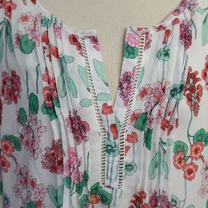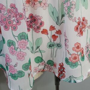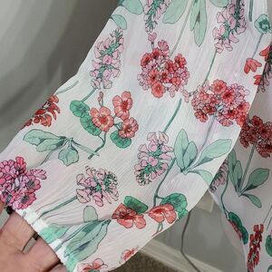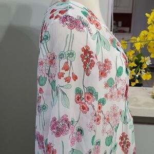 This lovely blouse is so eligant. size medium, pit to pit flat measurement is 20.5". sleevesare19". Top to bottomlengthis 25". Pink and red floral print. oversized. Excellent condition and quality. consider making a bundle and get an even better offer.