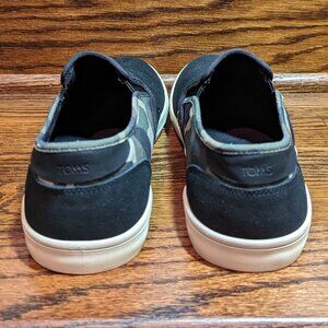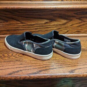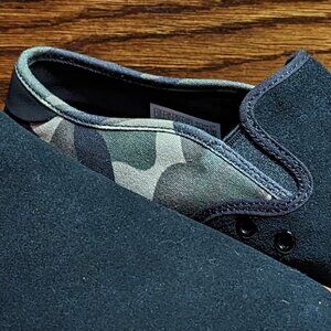 These minimalist slip-on sneakers feature a mostly-black body with camouflage accents on the heel. These shoes are new without tags and there is no wear or damage visible.