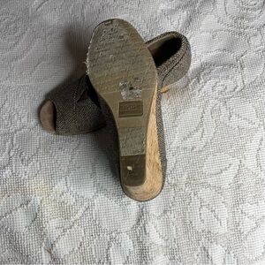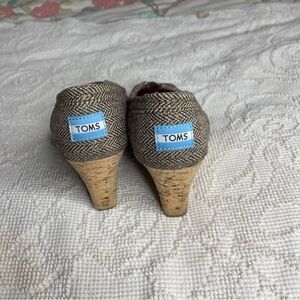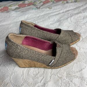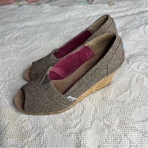 TOMS 7 Peep Toe WEDGE Shoes Sandals Brown Tweed Gold HERRINGBONE Cork Heel