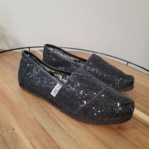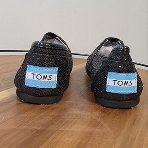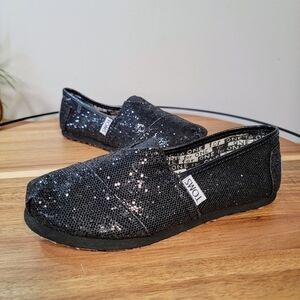 Black glitter Alpargata flats. Slip on style. Padded footbed. Toms logo patch on heels.