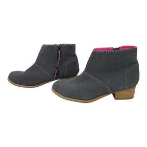 TOMS Ankle Boot Youth Size 6 Bootie Faux Suede Block Heel Pink Lining Side Zip Grey