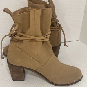 TOMS Ankle Boots Women's 7.5 Tan Suede Block Heel Wrap Lace Booties Casual Fall