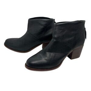 TOMS BLACK LEATHER HEEL ANKLE BOOTS 6.5 WOMENS BACK ZIP TASSEL BOOTIES WOOD HEE