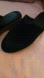 Stylish black suede slip-on clogs by TOMS. Features a comfortable wooden sole.