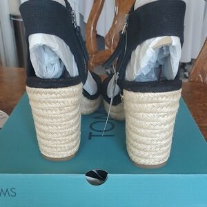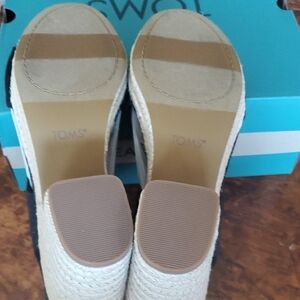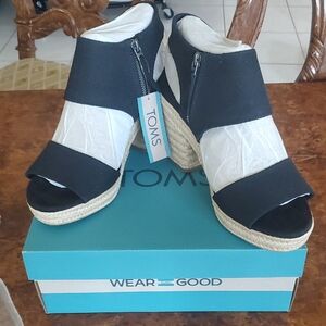 Chic TOMS wedges with a striking black and white pattern. Perfect for elevating any outfit.