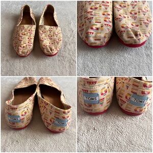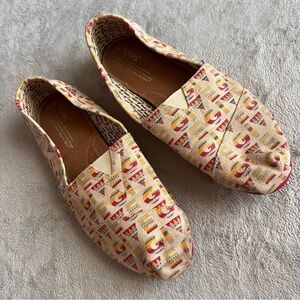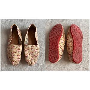 Good used condition. Alpargata Canvas Classics by TOMS in cream with red, orange, green and blue detailing. Special-edition GIVE collection. Southwest casual aesthetic. Super classic and comfy, a great everyday shoe. Slip-on shoes with round toe and elastic panel at vamp. Novelty geometric teepee "GIVE" print, see video. Note: light wear throughout with streetwear on bottom sole, light discoloration/fading to upper, minor faint marks at insole and slightly misshapen back, see photos. Size 9.5, see photos for measurements.