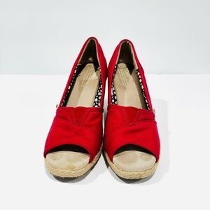 TOMS Classic Red Canvas Wedge Espadrille Peep Toe Shoes Sandals - VGUC - size 7.5