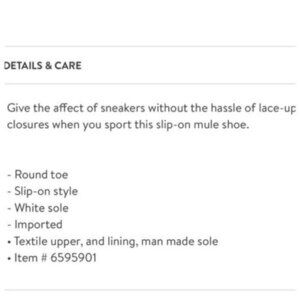 Give the affect of sneakers without the hassle of lace-up closures when you sport this slip-on mule shoe. . Round toe. Slip-on style. White sole. Imported Textile upper, and lining, man made sole