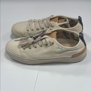 Stylish cream canvas sneakers by TOMS. Features gold eyelets and a classic lace-up design.