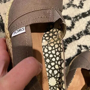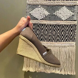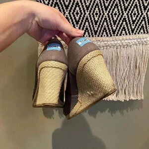 Size 10. Toms espadrilles classic taupe wedges. Open toe. Excellent used condition. See photos wear glue of the shoe is exposed. Reasonable offers welcome! Comes with brand new Toms shoe bag.