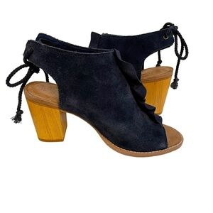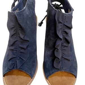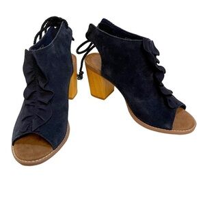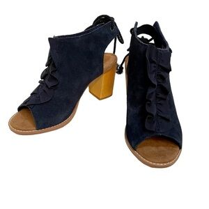 TOMS Elba Navy Suede Ruffle Heeled Peep Toe Bootie Sandal Size 6