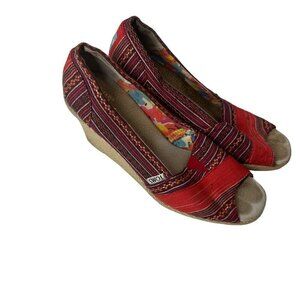TOMS Espadrille Wedge Pumps Peep Toe Red Boho Pattern Canvas Women size 8.5