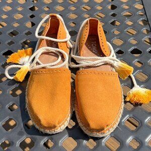 Espadrilles by Toms, Sweet looks from ground up, Lace-up design, Tassel detail; wrap around your ankle or go for the gladiator look and lace it on up your calf... Round toe, Woven sole, Textured tread. In Saffron suede (golden brown). Worn only to try on.