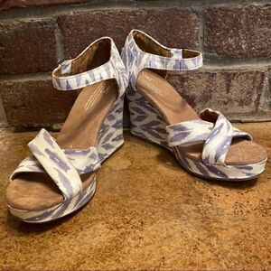 TOMS Sienna blue and white tribal ikat print platform wedge sandals