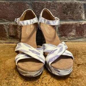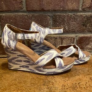 Like new Toms Sienna blue and white tribal ikat print platform wedge sandals. EUC, great shape, size 9.5, leather sole, fabric upper, textured bottom for grip, see pictures for details.