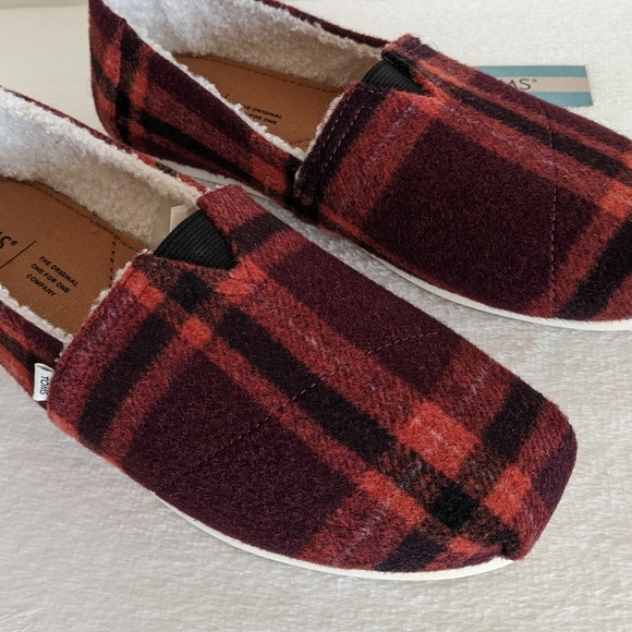 TOMS Slip On Flats Belmont Wool Blend Red Plaid Upper Faux Shearling Lined 9 NWT