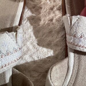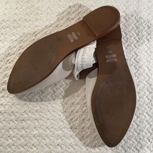 Semi pointed toe and so soft to slip into. An Aztec kind of design in silver and copper metallic arrows. There’s a detergent like droplet on the left middle section.