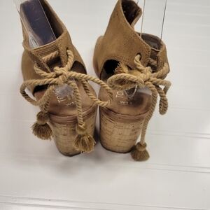 Peep toe sandal boot woth laser cut detail and tassel tie in back. Women's size 11.