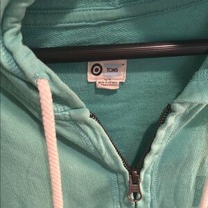 Stylish teal zip-up hoodie with front pockets. Features TOMS logo on the chest. Full zip