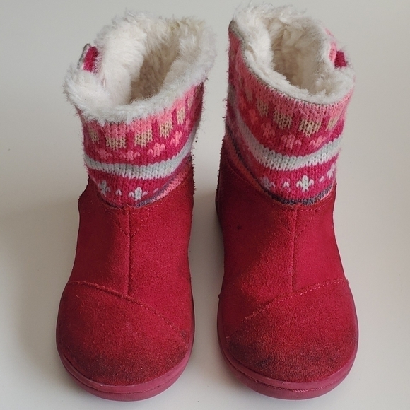 TOMS Toddler boots, leather with faux fur lining, velcro opening, shoes do have some wear. Size 5
