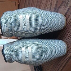 TOMS Wedge Bootie, sz 9.5, white, blue, gold, 3" heel