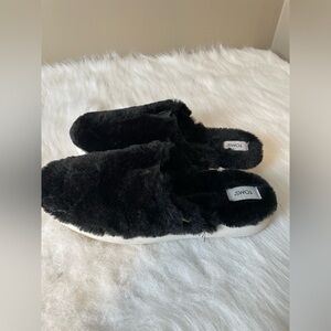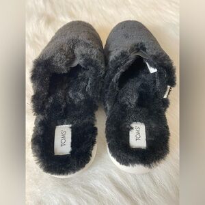 Like new. Super soft faux fur with light weight sole. Experience ultimate comfort with TOMS Women's Black Furry Slippers. Perfect for cozy days at home.slip on