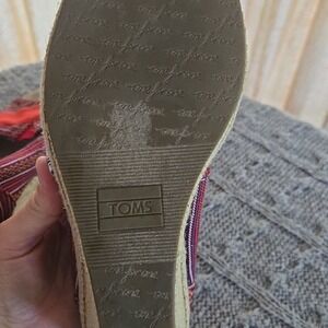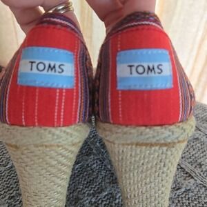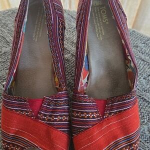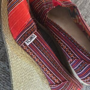 TOMS Lina Aztec Southwestern Print Peep Toe Wedge Sandals with espadrille platform. These vibrant and stylish women's wedges feature a colorful Aztec-inspired print in shades of red, purple, and orange, perfect for adding a bohemian touch to any outfit. The comfortable peep-toe design and classic TOMS elastic V-goring make them easy to slip on and off. Pre-owned condition with some wear and discoloration (see pics). Ideal for spring, summer, and casual occasions.