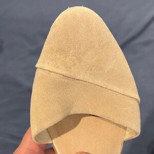 Elegant TOMS flats with a beige front and black-accented print. Slight discoloration to right shoe as pictured.