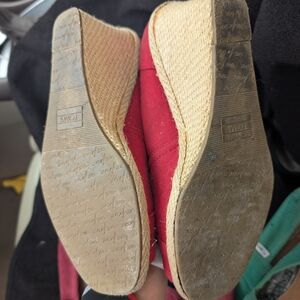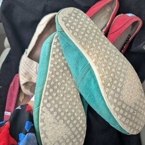 Bundle and save with this entire lot of Tom's shoes all 9.5. The striped ones have been well loved but have a lot of life in them. The red ones are old but have only been worn a handful of times. The flats are also worn with lots of life!