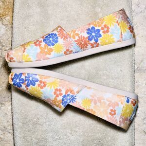 Brighten your step with these charming TOMS slip-on flats, adorned with a cheerful pastel floral print. Designed for effortless style and comfort, these shoes feature the iconic TOMS silhouette with a flexible canvas upper and a durable sole. The soft interior ensures a pleasant feel with every wear. Perfect for weekend strolls farmers market visits or casual brunches.