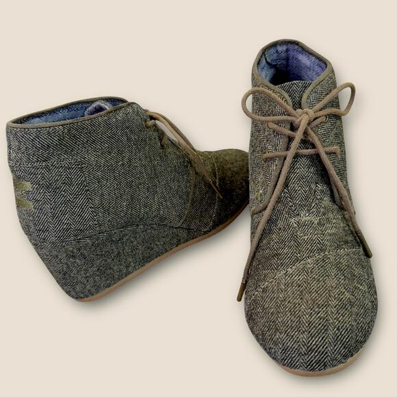 TOMS Womens Size 7 Wedge Heel Ankle Boots Desert Taupe Olive Herringbone Fabric