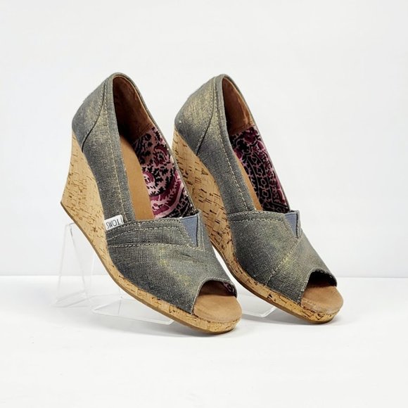 TOMS metallic canvas cork wedge shoes Sz 6.5