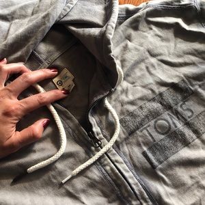 Take this super comfortable, couch lounging, or camp chillin sweater. Feel great wearing it since some of the proceeds of the purchase went to someone in need. TOMS shows philosophy. 100% cotton. One of the hooded strings is missing the end cap as seen on picture. Used and in great condition. Also has a place to put your thumbs through the sleeves.