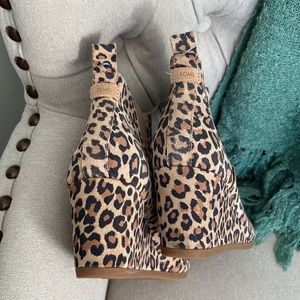 This pair of TOMS wedge booties is in excellent condition. Worn one time. Upper made of painted suede. Rubber soles for extra cushion.