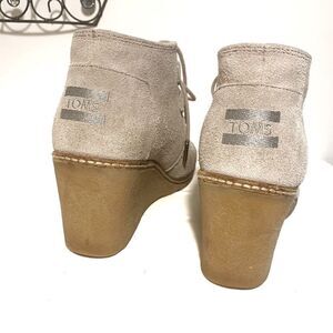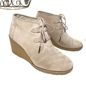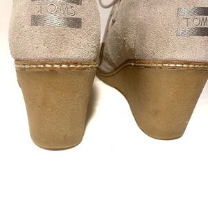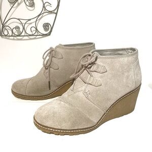 Beautiful gray suede Toms wedge bootie with lace up front and rubber sole. Great shape but for some very light signs of wear outer edges. To light for camera to really pick up where foot bends on both sides. Light wear on outer edges of rubber heels. See pic