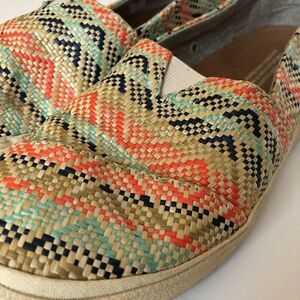 Beautiful multicolored woven straw like material TOMS in great condition. Size 6.5, one small mark on the woven part of toe as pictured in last photo.