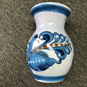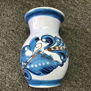 Vintage TONALA Mexican Pottery Vase Signed Blue Flower Bird Hand painted 6.5”.