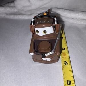 The Mater Tow Truck is larger in size (4”) and is manufactured by Disney. The hook on the back of the truck is still attached, but is coming loose. It needs a small repair.