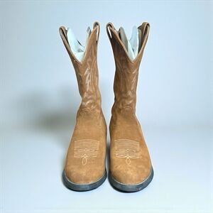 The product is a pair of TONY LAMA Brown Leather Mens Western Cowboy Boots in style BB2022, size 10.5D. These mid-calf boots feature a pull-on closure, leather lining and insole, leather upper material, and leather outsole. The boots are designed with embroidered accents and a Western cowboy theme, making them perfect for casual occasions. With a Western-style design and the reputable Tony Lama brand, these boots are a stylish and durable choice for any cowboy-inspired look. SMOKE FREE HOME