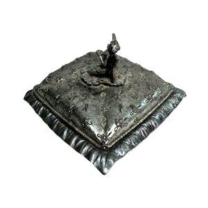 This handcrafted METZKE Fairy on a Pillow Pewter Trinket Box, made in the USA, is a perfect keepsake. Showcasing a silver fairy resting on a quilted pillow, it's a charming unisex gift or decor item.