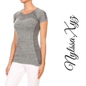 Fitted, short sleeve activewear tee in a gray color blocking with a round neck.