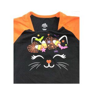 Black and orange short sleeve t-shirt with vinyl, kitty cat face applique. Pre-worn, like new. BUNDLE (2) or more Items from Sage's Closet & DEFINITELY SAVE 30%! A Shipping Discount may also apply! BUNDLE, BARTER, & DISCOVER YOUR SAVINGS!!! AAALLLL OFFERS CONSIDERED!!